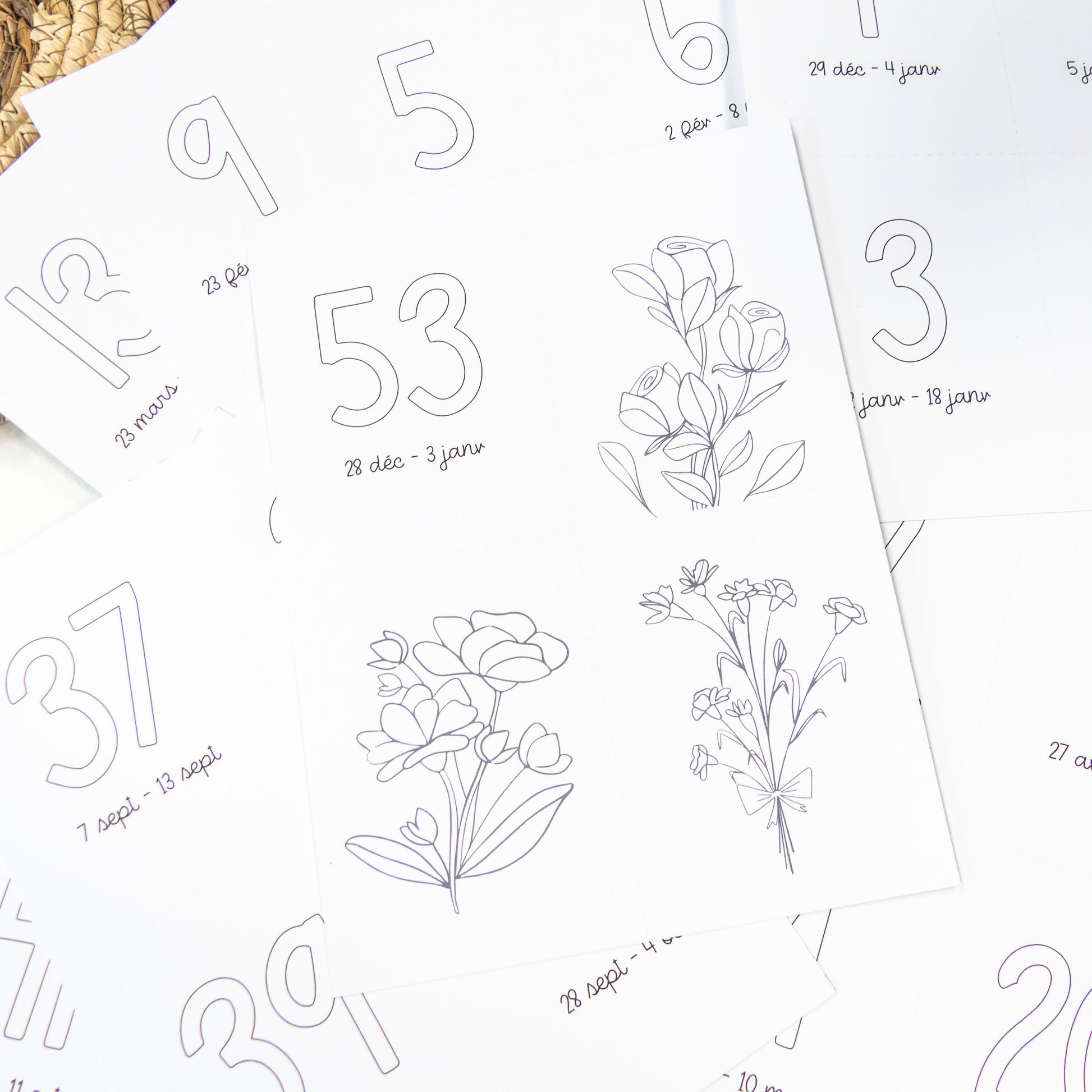 14 designs différents pour présenter les 53 semaines de l'année 2026 + 3 cartes à colorier.
