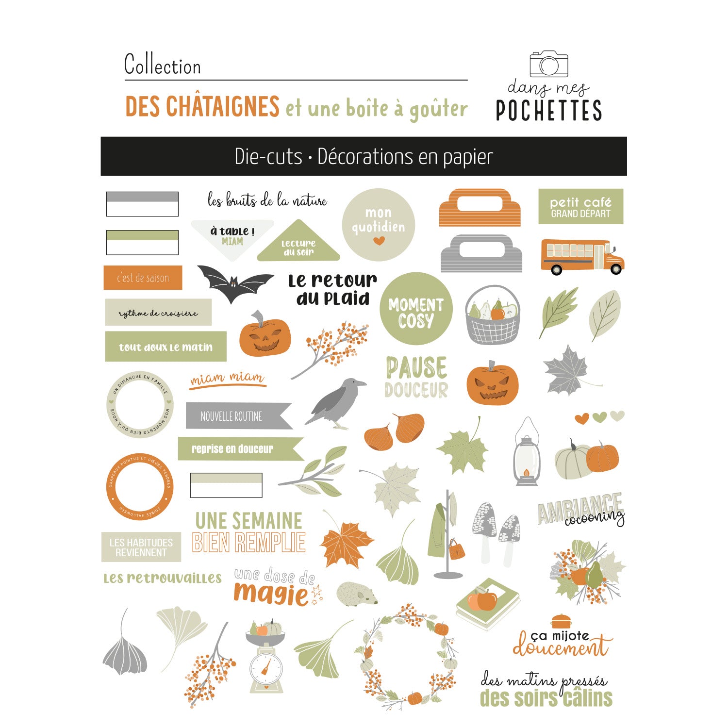 Assortiment de die-cuts de la collection Des châtaignes et une boîte à goûter.