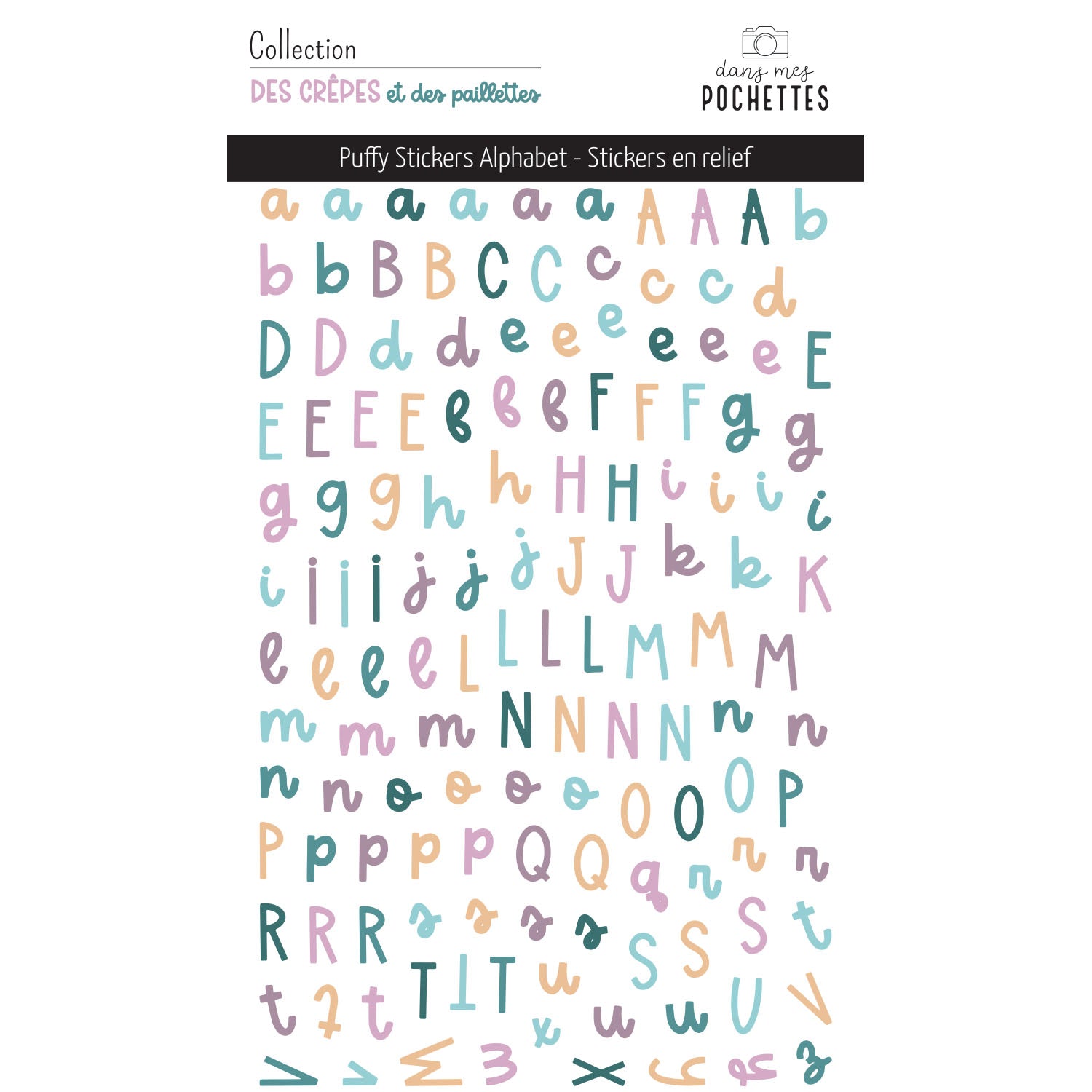 Planche de puffy stickers alphabets de la collection Des crêpes et des paillettes.