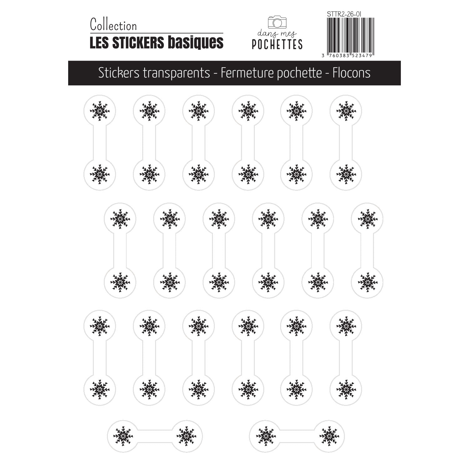 Planche de stickers transparents pour aider au maintien des cartes et photos dans les emplacements en haut des pochettes. Design : Flocons